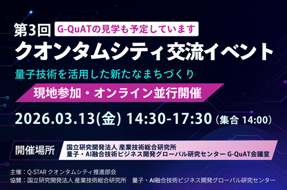 2026年3月13日に、国立研究開発法人産業技術総合研究所 量子・AI融合技術ビジネス開発グローバル研究センター様のご協力の下、Q-STAR(一般社団法人量子技術による新産業創出協議会)の参加企業との交流イベントを開催します。企業、自治体をはじめ、量子コンピュータなど量子技術にご興味がある方はぜひご参加ください。